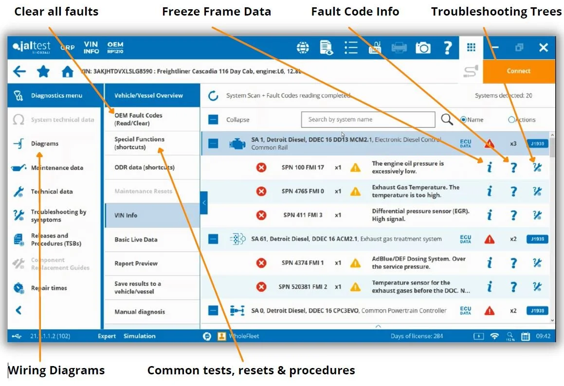 The auto-scan feature from Jaltest is an easy way to identify the make, model, systems and fault codes on any commercial vehicle you plug in to.